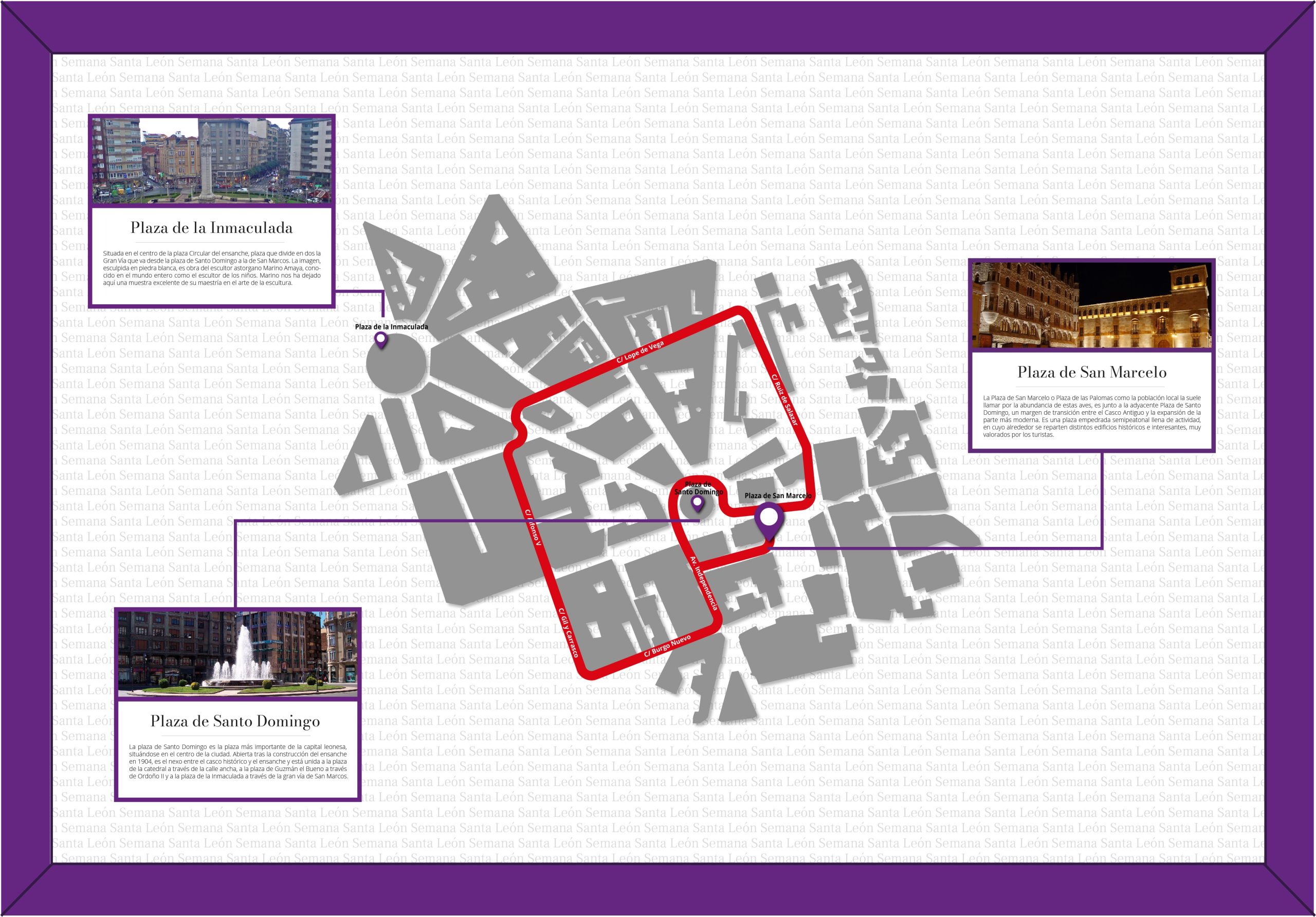 Legión VII, Independencia, Plaza de Santo Domingo (con vuelta), Plaza de San Marcelo, Ruiz de Salazar, Lope de Vega, San Agustín, Alfonso V, Gil y Carrasco, Burgo Nuevo, Independencia, Legión VII y Plaza de San Marcelo.